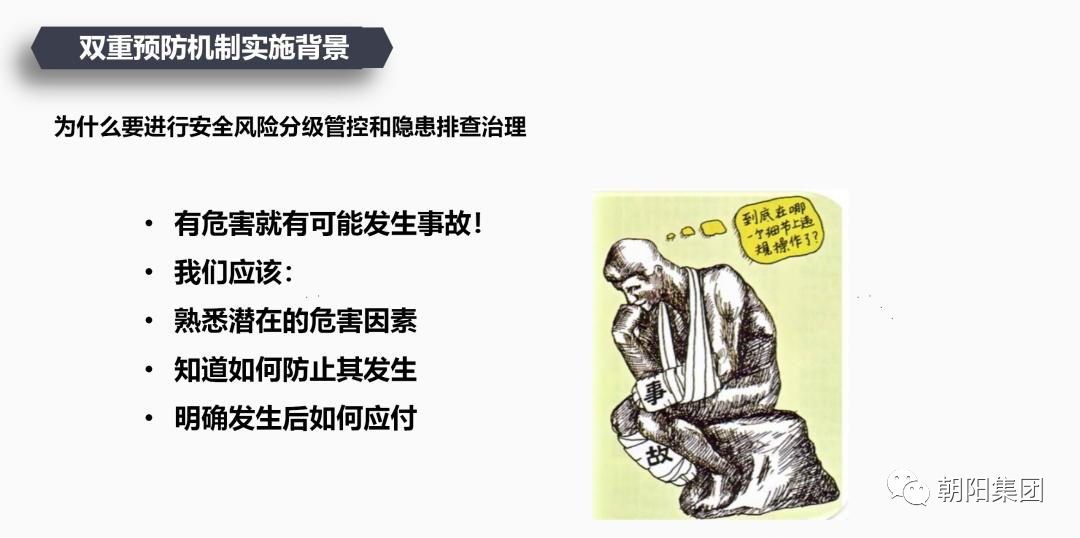 在培訓(xùn)活動中,朝陽集團(tuán)申總詳細(xì)給員工講解了風(fēng)險分級管控、隱患排查治理的概念、方法和流程等,并強(qiáng)調(diào)了雙重預(yù)防機(jī)制在安全生產(chǎn)中的重要性。申總首先對雙重預(yù)防機(jī)制的定義進(jìn)行了闡述,再對風(fēng)險分級管控與隱患排查治理的雙重預(yù)防機(jī)制進(jìn)行了深入的講解。